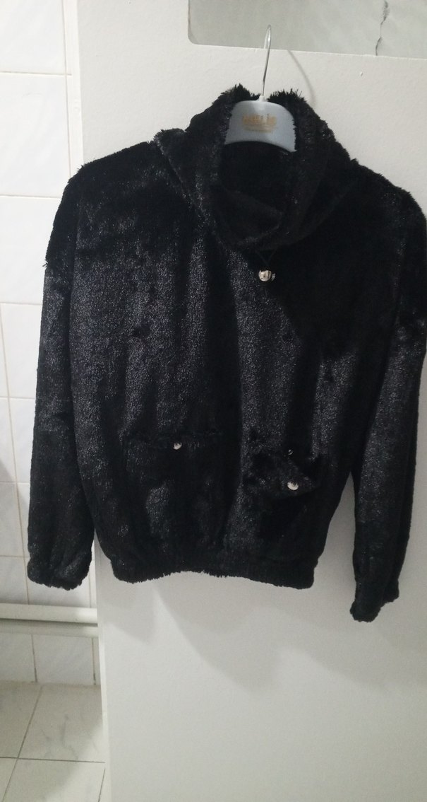 Siyah uzun kollu ve bol kesim bir Yumuşak peluş kumaştan ve kürk detaylı, rahat ve gündelik kullanıma uygun. yeni kulkanılmadı xs. s. m uyumlu tüylü harika bir parça