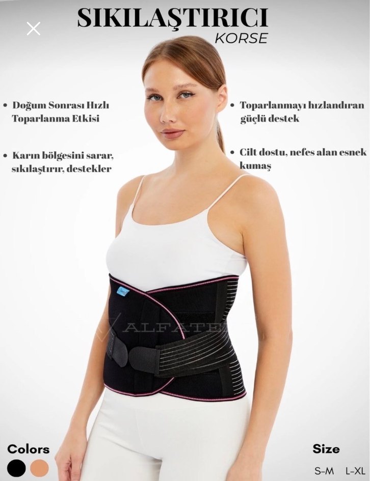 Siyah kısa boy, vücuda oturan sıkılaştırıcı korse, doğum sonrası toparlanmayı hızlandırır. Karnı sarar, cilt dostu, nefes alan esnek kumaştan üretilmiştir. Güçlü destek sağlar. Yeni ürün. Sezeryan ya da normal doğum sonrası kullanılabilir.