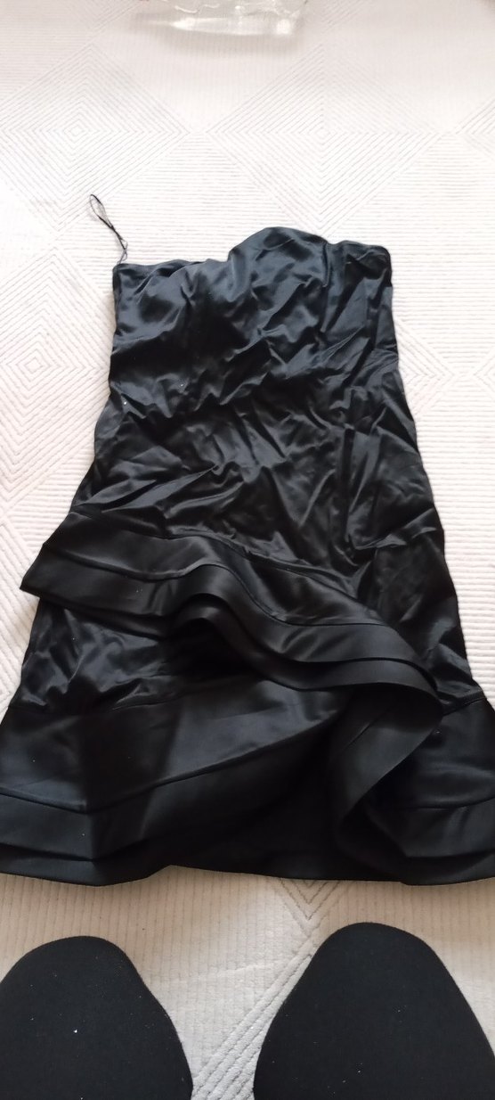 Siyah, askısız kesim ve, vücuda oturan kısa abiye elbisedir.