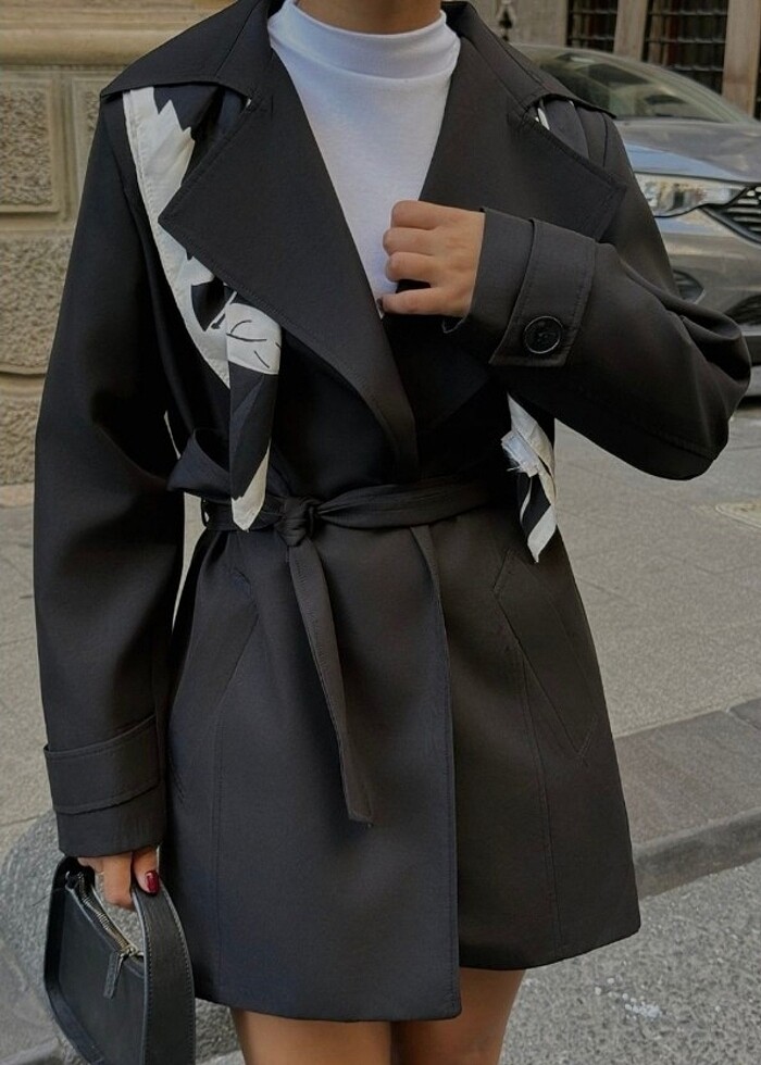 M bedendir. Siyah Kısa Trençkot Görselde XS Beden Kullanılmıştır Elbise Boyu:80 Cm Göğüs:50 Cm Manken Ölçüleri Boy:160 Kilo: 50 Göğüs: 80 Bel: 62 Kalça: 94 şal dahil değildir