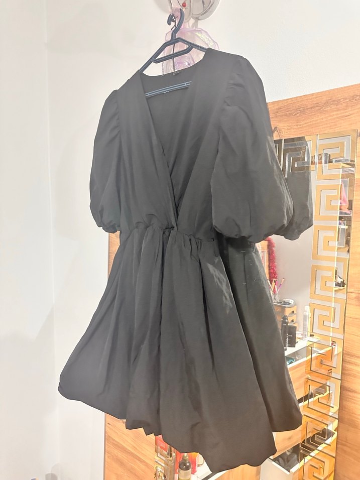 Siyah kısa V Yaka Balon etekli elbise