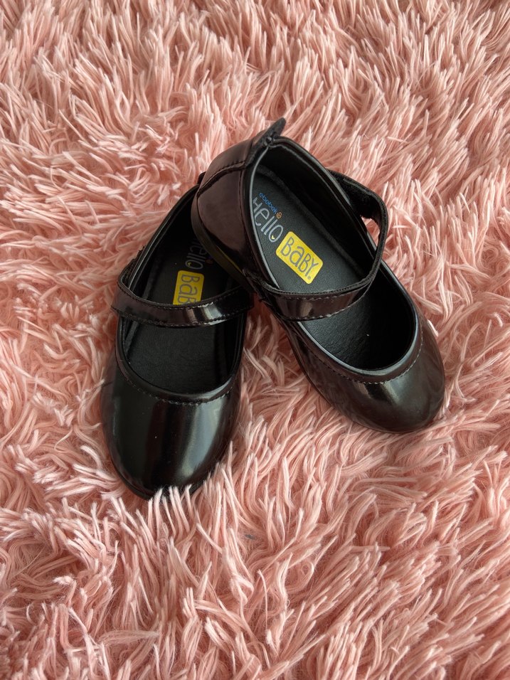 Siyah renk, parlak yüzeyli kız çocuk babet ayakkabı, kolay giyimi sağlayan Velcro bantlı, gotik tarzda. Marka: Ebebek