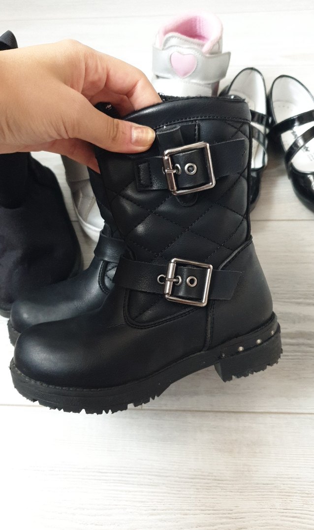 Siyah deri biker tarzı kız çocuk botları, tokalı kayışlar ve sağlam taban ile trendy günlük kullanım için uygundur.