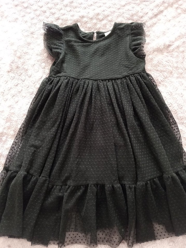 Siyah kız çocuk elbise, fırfırlı detaylı, bol kesim ve V yaka. Yumuşak sentetik kumaştan, ince puantiyeli dokusu ve askılı kollara sahip.