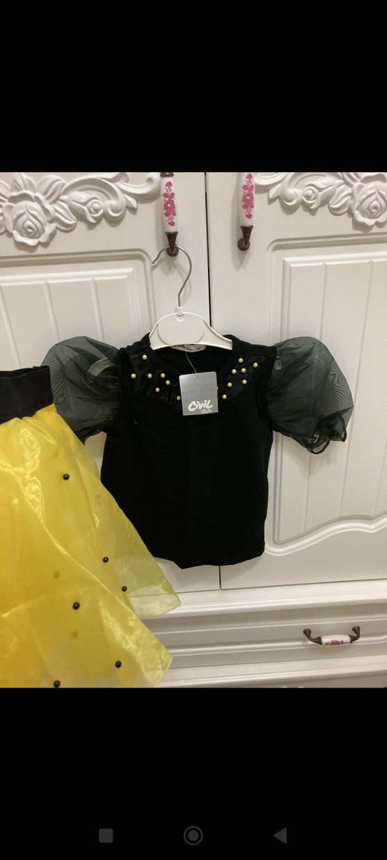 Siyah renkli, kısa kabarık kollu, yuvarlak yakalı ve boncuklu kız çocuk elbisesi. Gevşek kesim, koyu baskılı gotik tarzda, etek sentetik kumaştan yapılmıştır. bluz penye