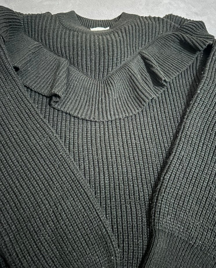 Siyah kız çocuk kazak göğüs beli fırfırlı boyu 52 cm omuz 47 cm kol boyu 52 cm Çok rahat