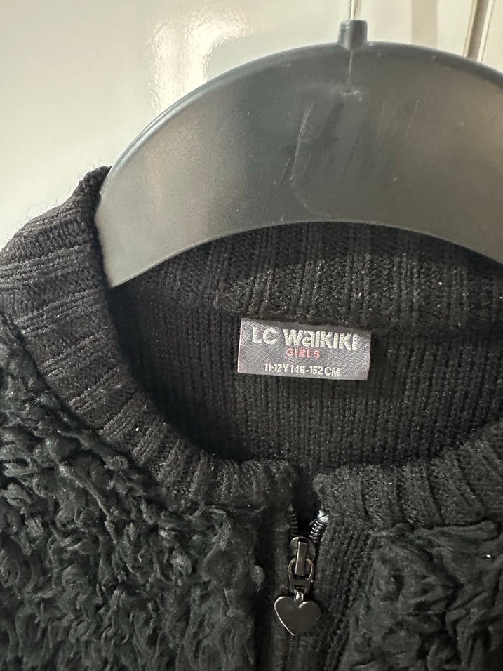 Örgü yünden yapılmış, uzun kollu, bisiklet yaka ve fitted kesime sahip siyah kız çocuk kazak. Marka: LC Waikiki.