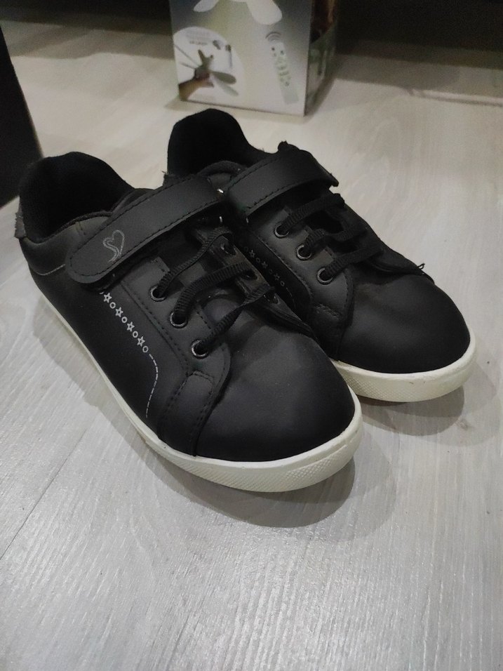 Siyah renkli, lastik tabanlı kız çocuk spor ayakkabısı.Lastikleri esnekliğini kaybetmiş ama giymeye engel değil,cırtında da sökülme var ama dikilir böyle de giyilir, başka herhangi bir yırtık veya bozulma yok,birinin işine yarasın diye uygun yazıyorum #ayakkabı #çocuk