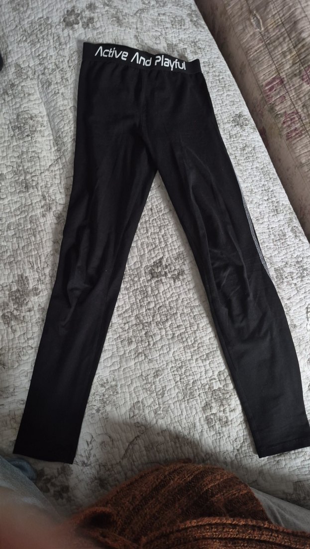 Elastik bel bantlı,yazılı siyah tayt. penye pamuk kumaştan, spor ve günlük kullanıma uygun. etiketini kestim,çocuğuma aldığım ürün etiketi rahatsız ettiğinde ,keserim genelde