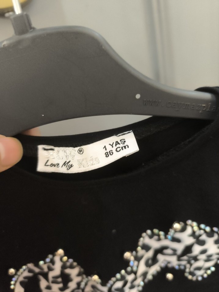 bisiklet yaka ve baskılı taşlı detaylı siyah kız çocuk tişörtü. Rock punk tarzı ve dar kesim. 1 yaş, 86 cm.