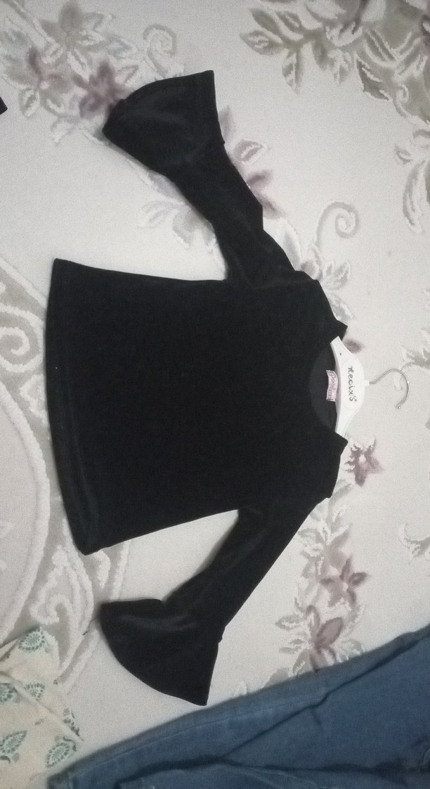 Siyah, dar kesim, uzun kollu kız çocuk bluzu, fırfırlı kollu ve yuvarlak yaka, sentetik dokulu kumaştan, gotik tarzda.