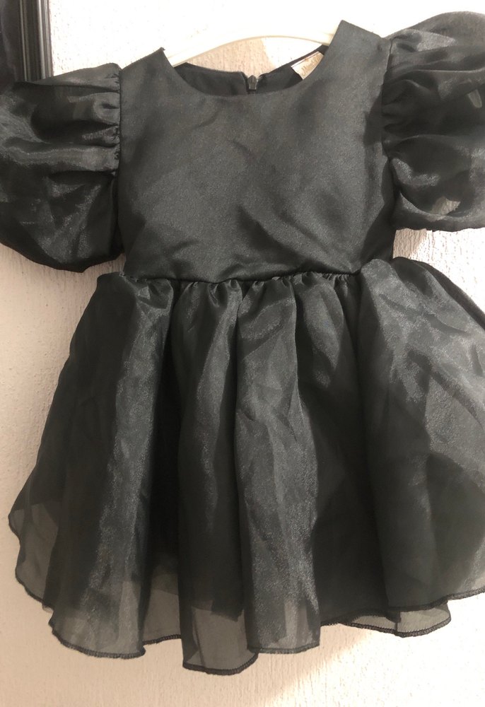 Siyah renkte, sentetik kumaştan yapılmış kız çocuk elbisesi, kısa kabarık kollu ve V yakalıdır. Fırfırlı etek kısmıyla gotik tarz sunar.