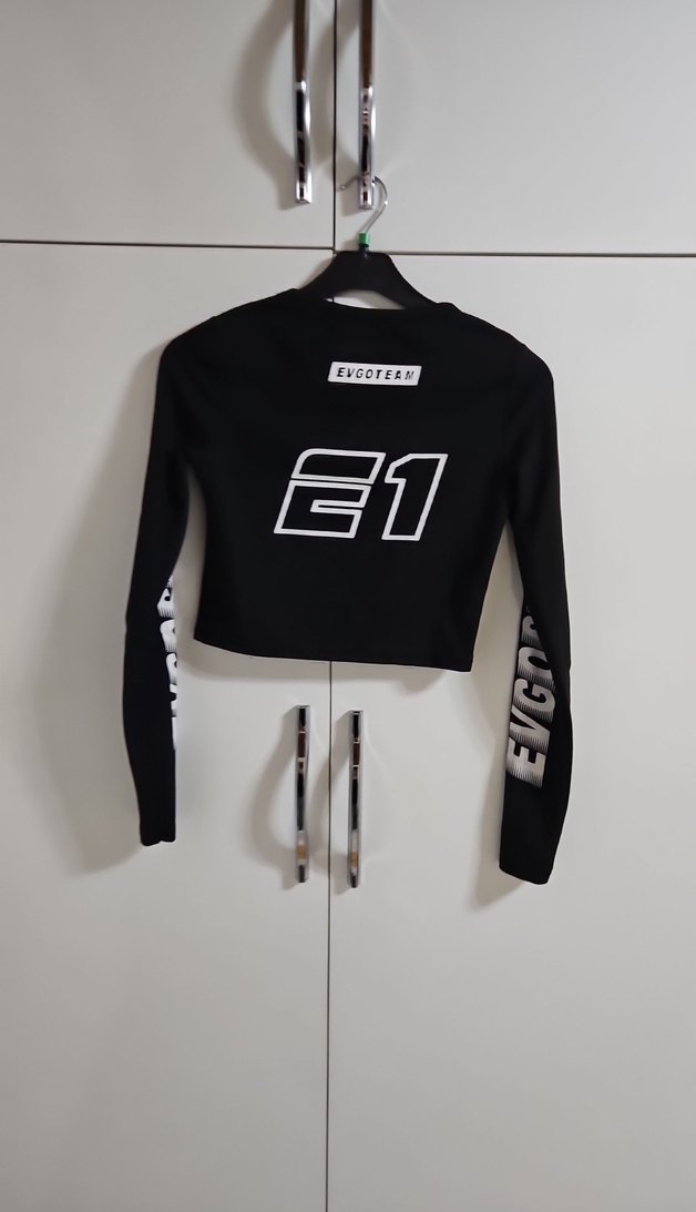 Siyah, uzun kollu, kısa kesim kiz sweatshirtü. E1 ve EVGTEAM baskılı, velcro detaylı, yumuşak ve sıcak kumaştan, spor ve günlük kullanıma uygun.