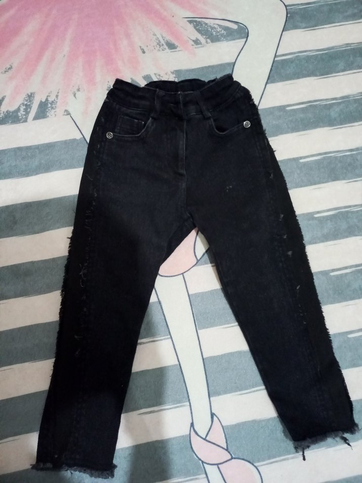 Kız çocuğu için siyah taşlanmış kot pantolon. Beli ayarlanabilir. Hiçbir kusuru yoktur. Sadece bir kez giyildi. 3 - 4 yaş için uygundur. Boy : 53 cm