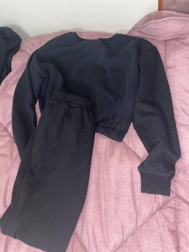 Siyah renkli, uzun kollu ve yuvarlak yaka kız sweatshirt ile eşofman takımı, rahat kesimli.