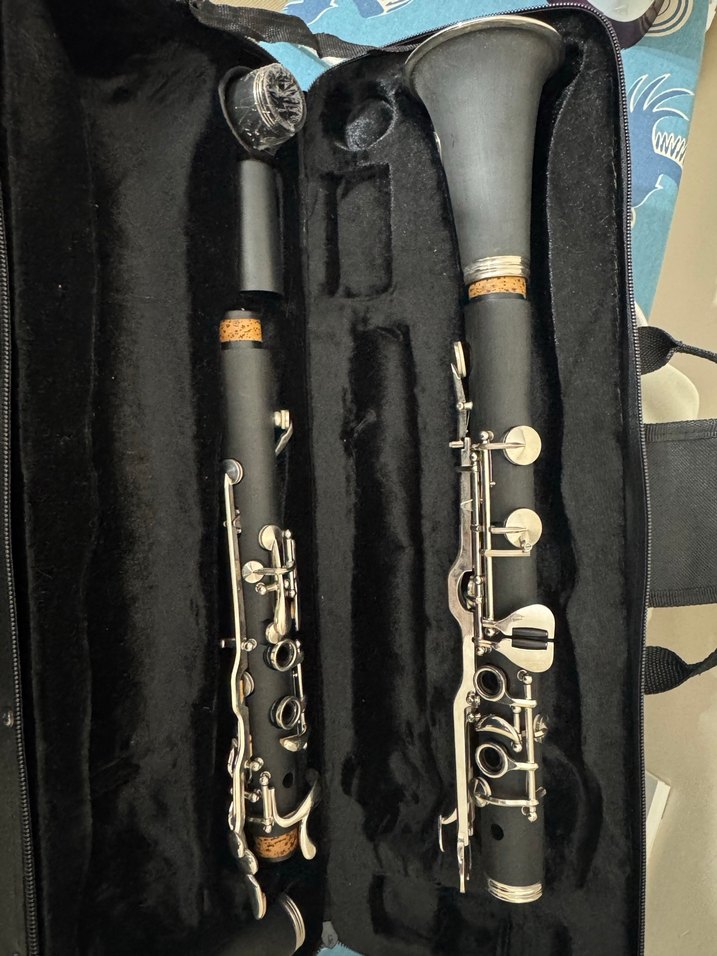 Gümüş tuşlu siyah klarnet, yumuşak astarlı siyah kılıf içinde, ağızlık ve boru parçalarıyla birlikte.
