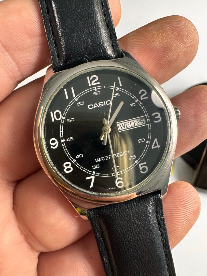 Siyah renkli Casio erkek kol saati, klasik yuvarlak kadran, gün ve tarih göstergesi ile deri kayışa sahiptir. Suya dayanıklıdır. ⌚