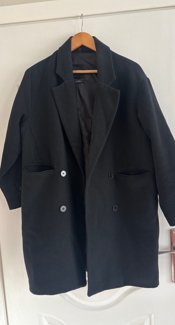 Klasik tasarıma sahip siyah çift düğmeli kaban, iki ön cepli ve rahat iç astarlı.