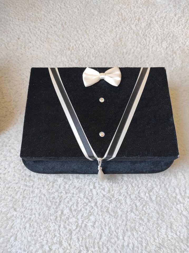 Beyaz papyon, çentikli yaka ve düğme detaylarıyla siyah damat sandığı