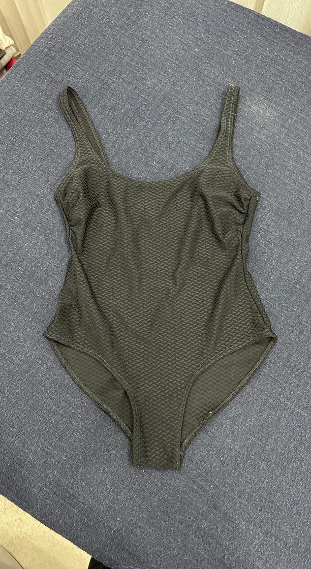 siyah renkte, dokulu kumaştan yapılmış, kolsuz ve vücuda oturan kadın mayo. Plaj için sade ve şık bir tercih. Sırt dekoltesi mevcuttur