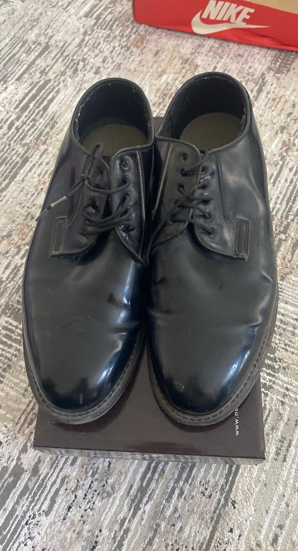 Siyah, tok ve bağcıklı klasik erkek ayakkabısı. Kauçuk tabanlı, desen içermeyen ve ofis kullanımı için uygun. 43 numara kullanılmış makul ürün