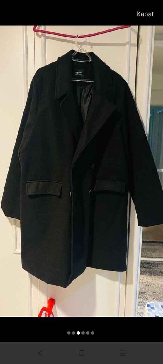 Siyah klasik kaban, ön cepler ve düzgün astar ile sade tasarım. Soğuk havalar için uygundur.