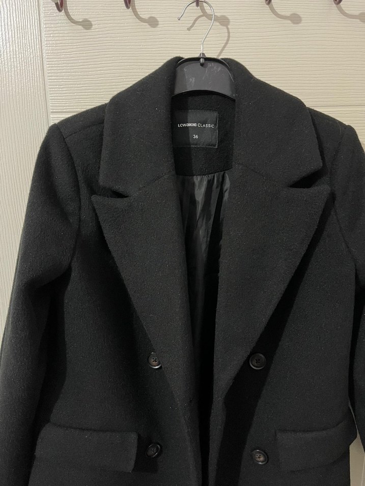 Siyah renkli, geniş yaka ve çift düğmeli klasik kadın kabanı, yumuşak ve sıcak kumaştan üretilmiştir.