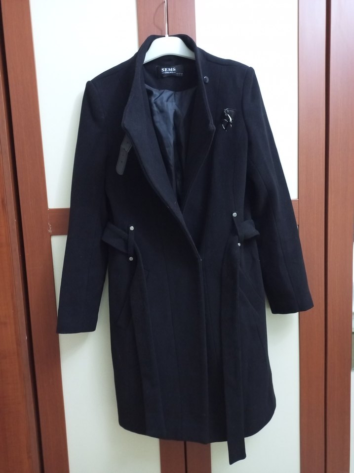 Siyah klasik kadın kaban, kemerli ve astarlı. Ceplerinde düğme detayları bulunur, şık ve sade tasarıma sahiptir. ❄️sorunsuz defosuz kaşe kaban