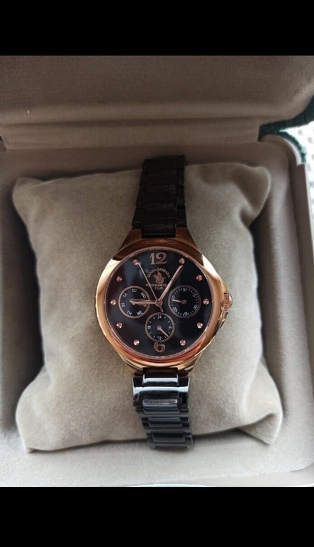 Siyah kayışlı, tokalı kadın kol saati, çağdaş koyu kadran ve gül altın detaylarla klasik ve trend bir görünüm sunar. ⌚
