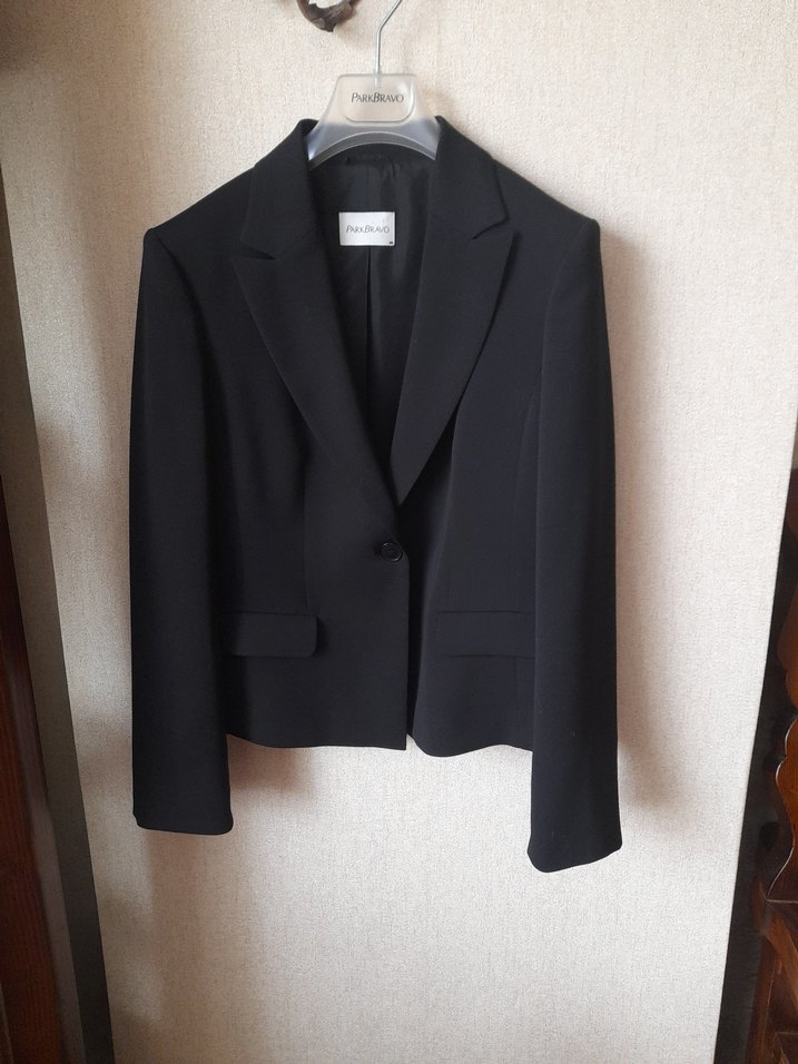 Siyah renkte, kısa boy mini kadın blazer ceket. Düğmeli, klasik yakalı ve uzun kollu. Ofis için uygun, rahat kesim ve yumuşak kumaş. arkadan ikitaraflı yırtmaçlı
