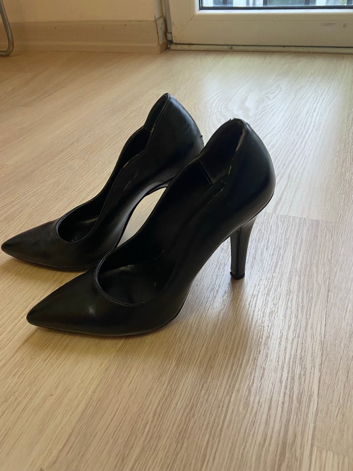 Siyah kauçuk malzemeden yapılmış, desensiz stiletto topuklu ayakkabılar. Ofis için uygun, gotik ve klasik şıklıkta, zahmetsiz şıklık sunar.