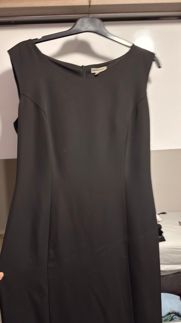 Siyah, kolsuz, uzun elbise. İnce oturan kesim ve hafif drapeli detaylara sahip. Özel günler için uygun klasik şıklıkta.Balık elbise 40-42 bedene rahatlıkla olur