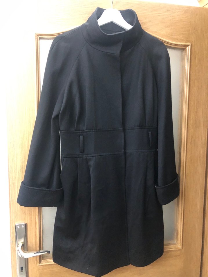 Yüksek yakalı, uzun kollu ve manşet detaylı siyah kaban. Bel kısmı oturaklı ve ön ceplidir, yumuşak ve sıcak kumaştan üretilmiştir. Kemeri kayıp o yüzden uyguna veriyorum