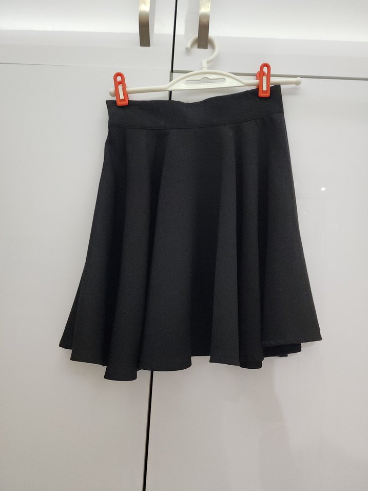 Siyah renkte, kloş etek. Herhangi bir deformasyonu yoktur. Bedeni bana olmadığından satıyorum. Ölçüleri fotoğraflarda mevcut.