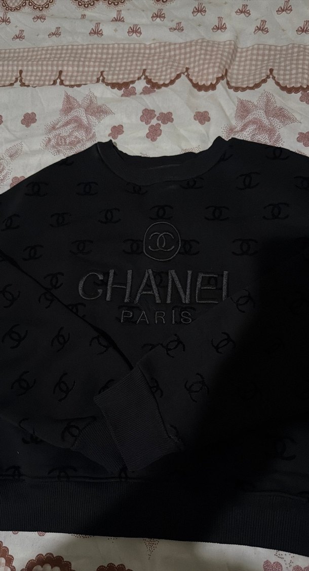 Siyah renkli, yuvarlak yaka ve uzun kollu bu sweatshirt bol kesim ve örme dokulu. Chanel Paris baskılı modeliyle trend sokak stili için uygundur.