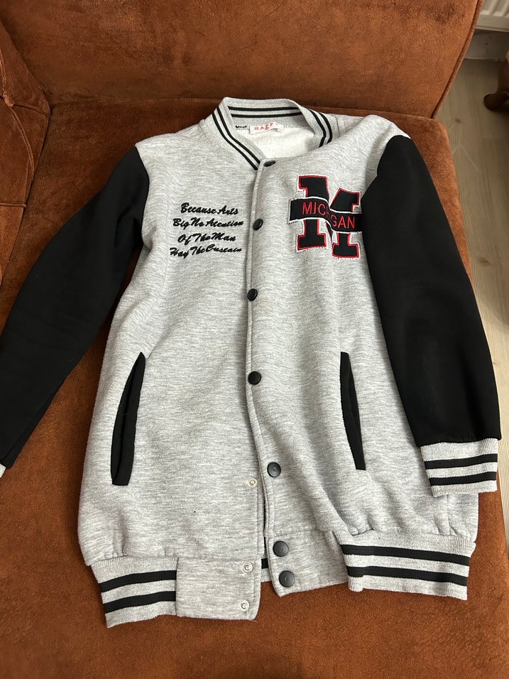 Siyah kollu, düğmeli önlü ve baskılı detaylı, yumuşak gri kumaştan bol kesim erkek çocuk ceketi. Sokak stili için uygun.