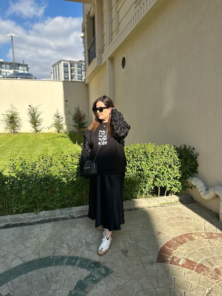 Quzu marka Siyah, kolları gül kabartma desen sweat rahat kesimi ve ipeksi kumaşıyla günlük kullanıma uygun şık bir görünüm sunar. Trend sokak stili için idealdir.