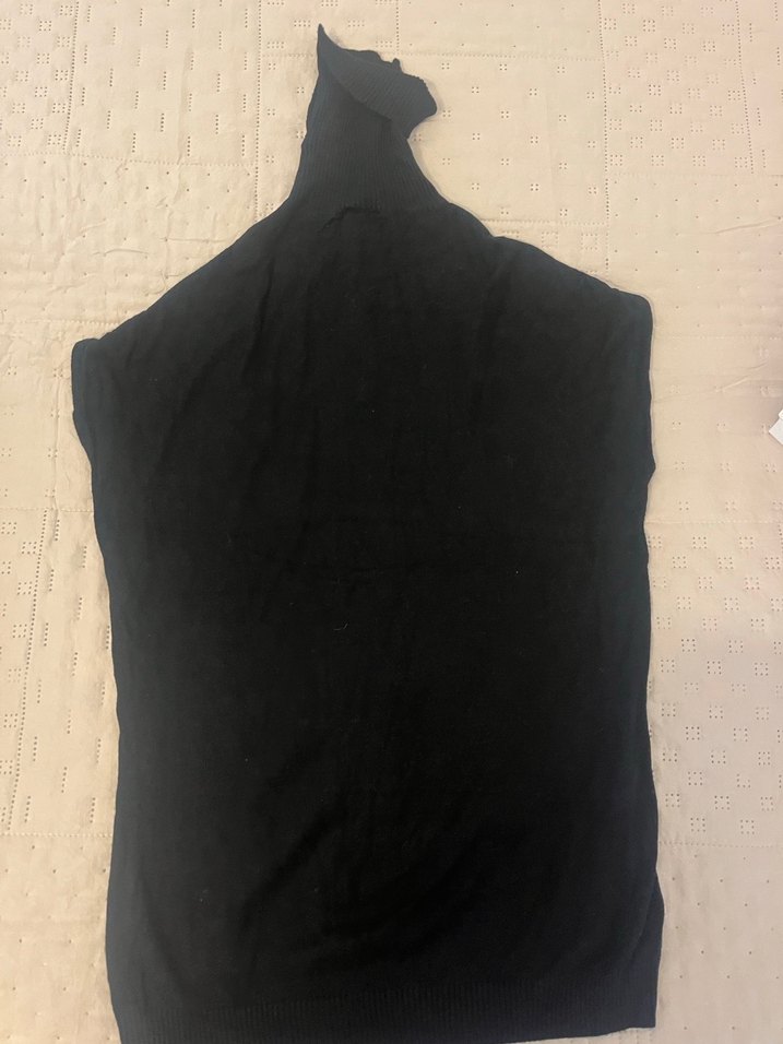 Kolsuz, balıkçı yakalı ve drapeli siyah bluz Keten kumaştan, vücuda oturan kesimi ve midi boyuyla minimalist ve şık bir görünüm sunar.