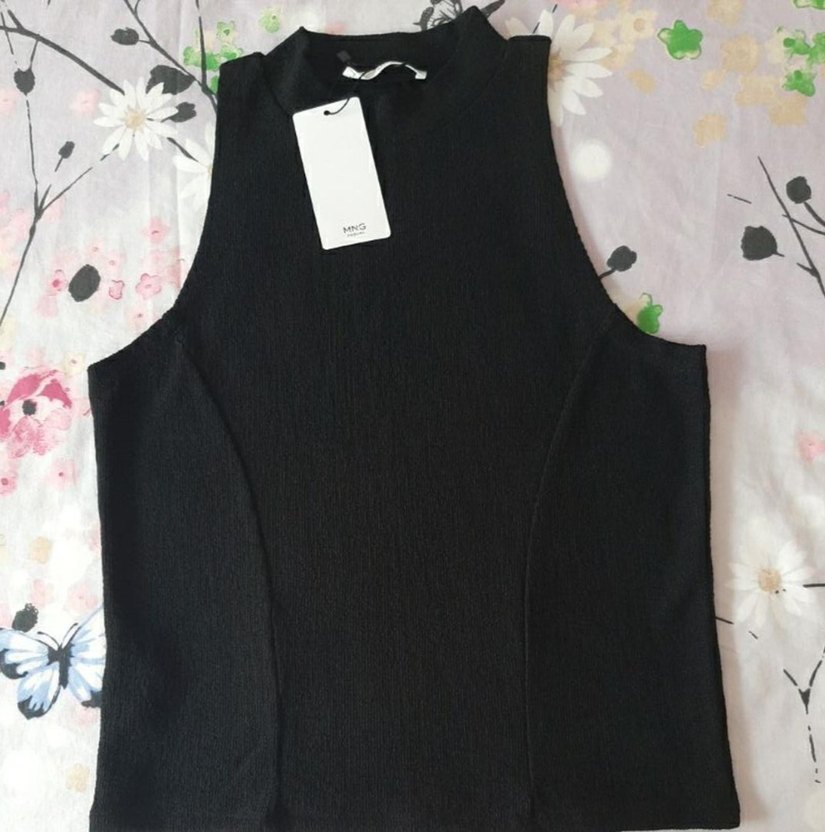 Mango düğmeli, yükek yakalı, siyah kolsuz bluz.