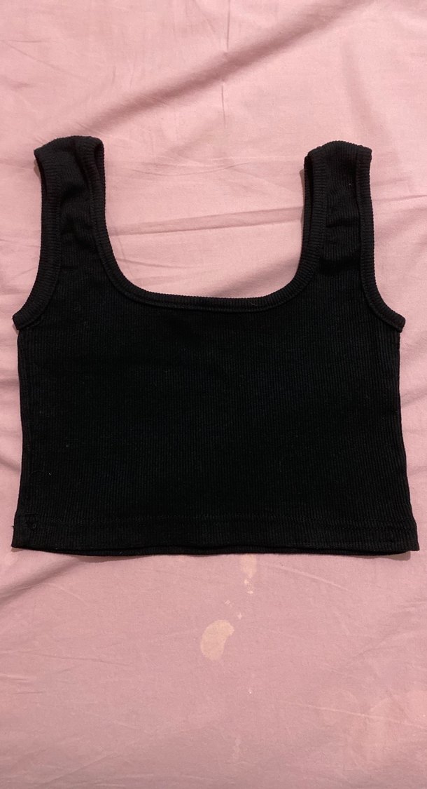 Siyah kolsuz crop top, tekne yaka ve vücuda oturan kesim. Pürüzsüz sentetik kumaştan üretilmiştir. Günlük sokak stili için uygundur.