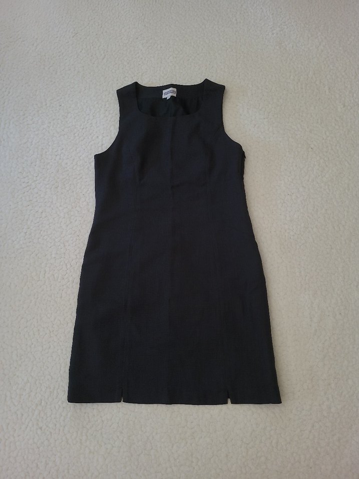 Siyah kolsuz midi elbise, yüksek yakalı ve rahat kesimdir. sade ve ofis için uygun şık bir modeldir. kesimi kalıbı mükemmel diz üstü astarli elbise
