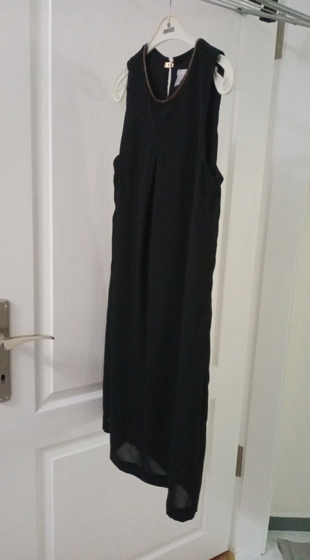 Siyah, kolsuz, mini şık saten elbise, Minimalist ve normcore tarzlara uygun, ofis kullanımı için idealdir.