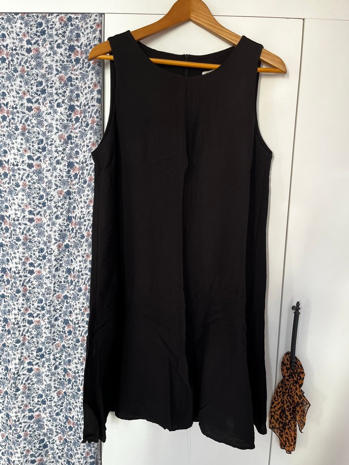 Siyah kolsuz elbise bol kesim ve drapeli tasarıma sahip, yumuşak keten kumaştan üretilmiştir. Askısız yakası ve minimalist tarzıyla günlük kullanıma uygundur.