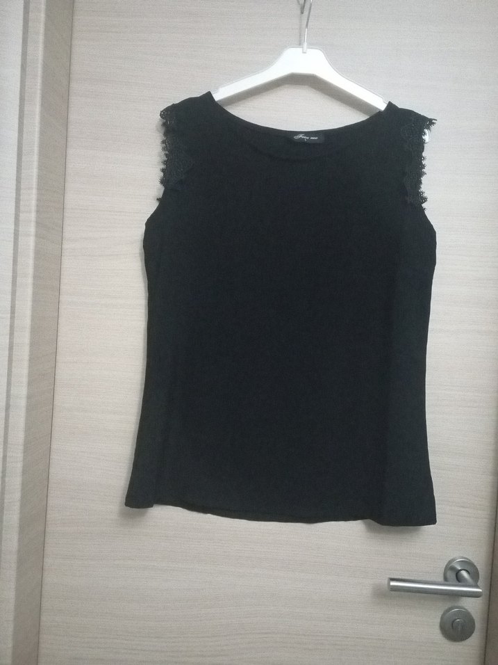 Kolsuz, yuvarlak yakalı siyah bluz, omuzlarda fırfır detaylıdır. Sentetik kumaştan yapılmış, Günlük kullanıma uygundur.