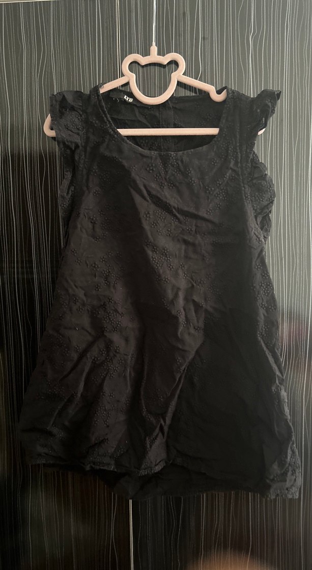 Nefes alabilen keten kumaştan, bol kesim ve fırfır detaylı siyah kolsuz hamile bluzu. V yaka ile gotik tarzda, günlük kullanıma uygun.