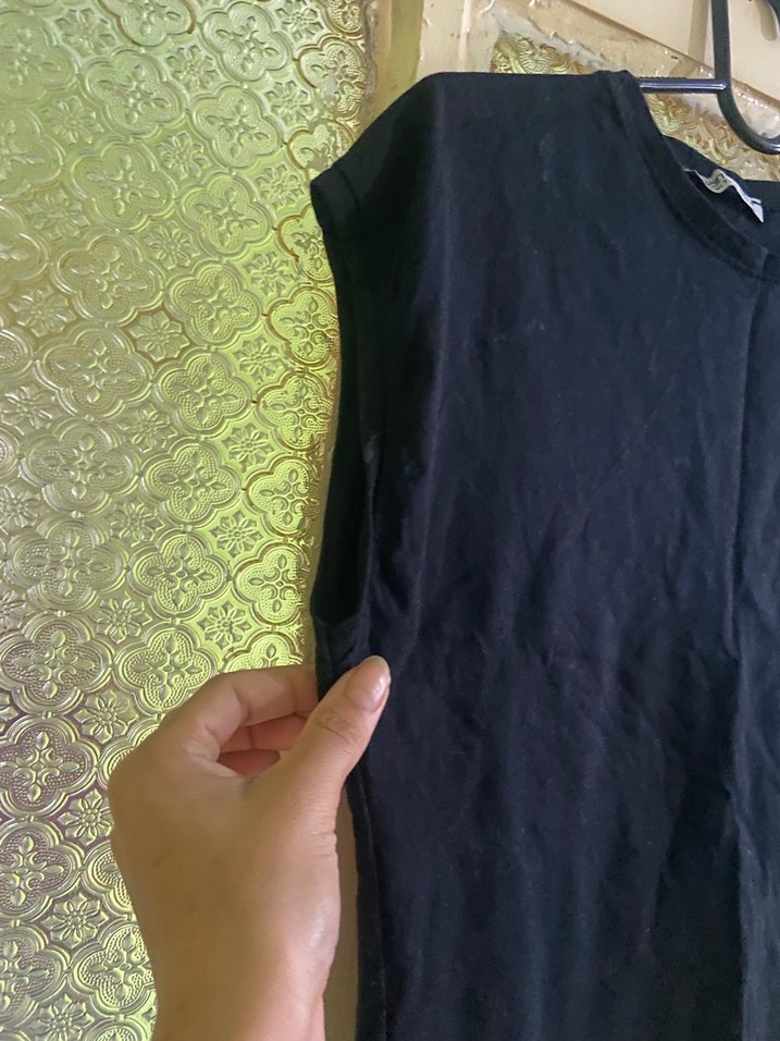 Kolsuz ve yuvarlak yakalı, vücuda oturan siyah hamile tişörtü. Sentetik kumaştan, midi boyda ve yanında yırtmaç detayı bulunur.