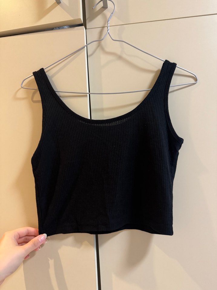 Kolsuz, siyah keten crop top, yuvarlak yaka ve vücuda oturan midi kesime sahiptir. Minimalist, sokak stilinde, günlük kullanıma uygundur. Az kullanılmıştır kusuru bulunmamaktadır . L beden olmasına rağmen biraz dar bir üsttür