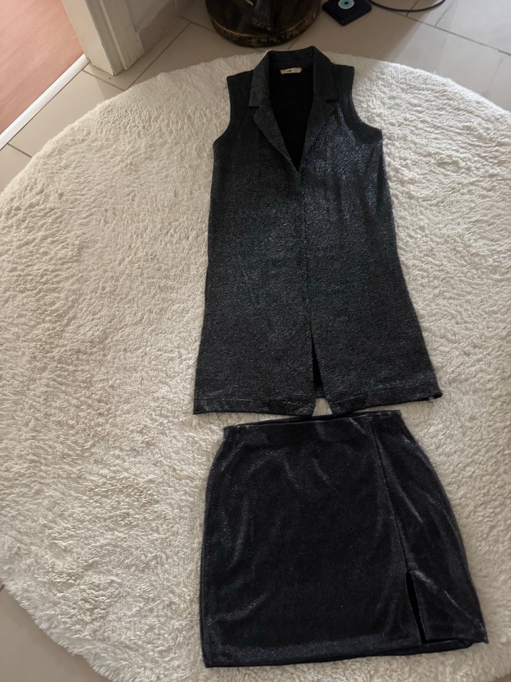 Siyah simli yelek ve etek şık döğün dernek kıyafeti Ambar marke S beden tam kalıp yelek boy 95 cm.Etek bel 35 cm.kalın lastik var basen 45 cm. Boy 40 cm.parlak simli davet kıyafeti..yeni hiç giyilmedi etiketi çıkarmıştım ama kısmet olmadı etek içi astarlı