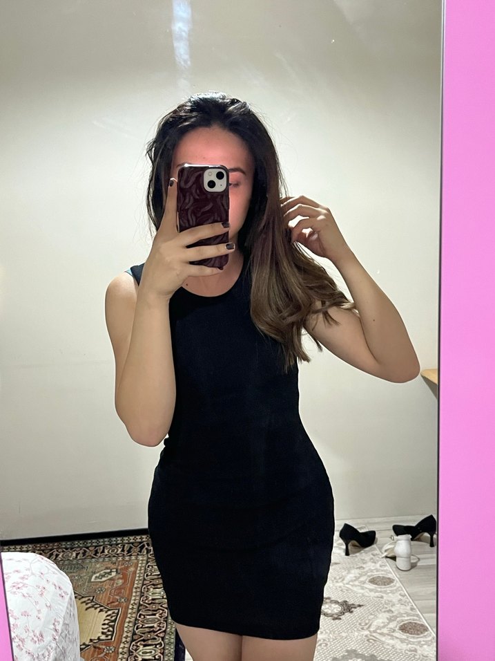 Düz siyah, kolsuz ve midi uzunlukta bu dar kesim elbise, düz yaka ve pürüzsüz sentetik kumaştan üretilmiştir. Minimalist tarzıyla romantik akşamlar için şık ve rahat bir seçimdir 58 kiloyum boyum 1.60