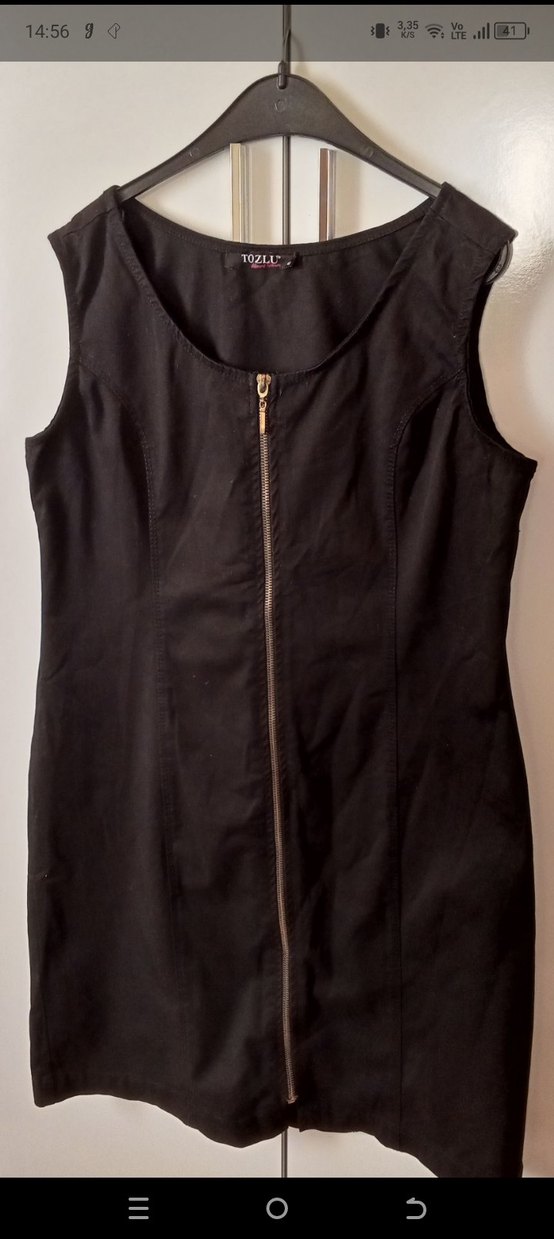 Keten kumaştan yapılmış, V yaka ve ön fermuarlı, siyah kolsuz, vücuda oturan midi elbise. Minimalist gotik tarzda, günlük kullanıma uygun. Marka: TOZLU.